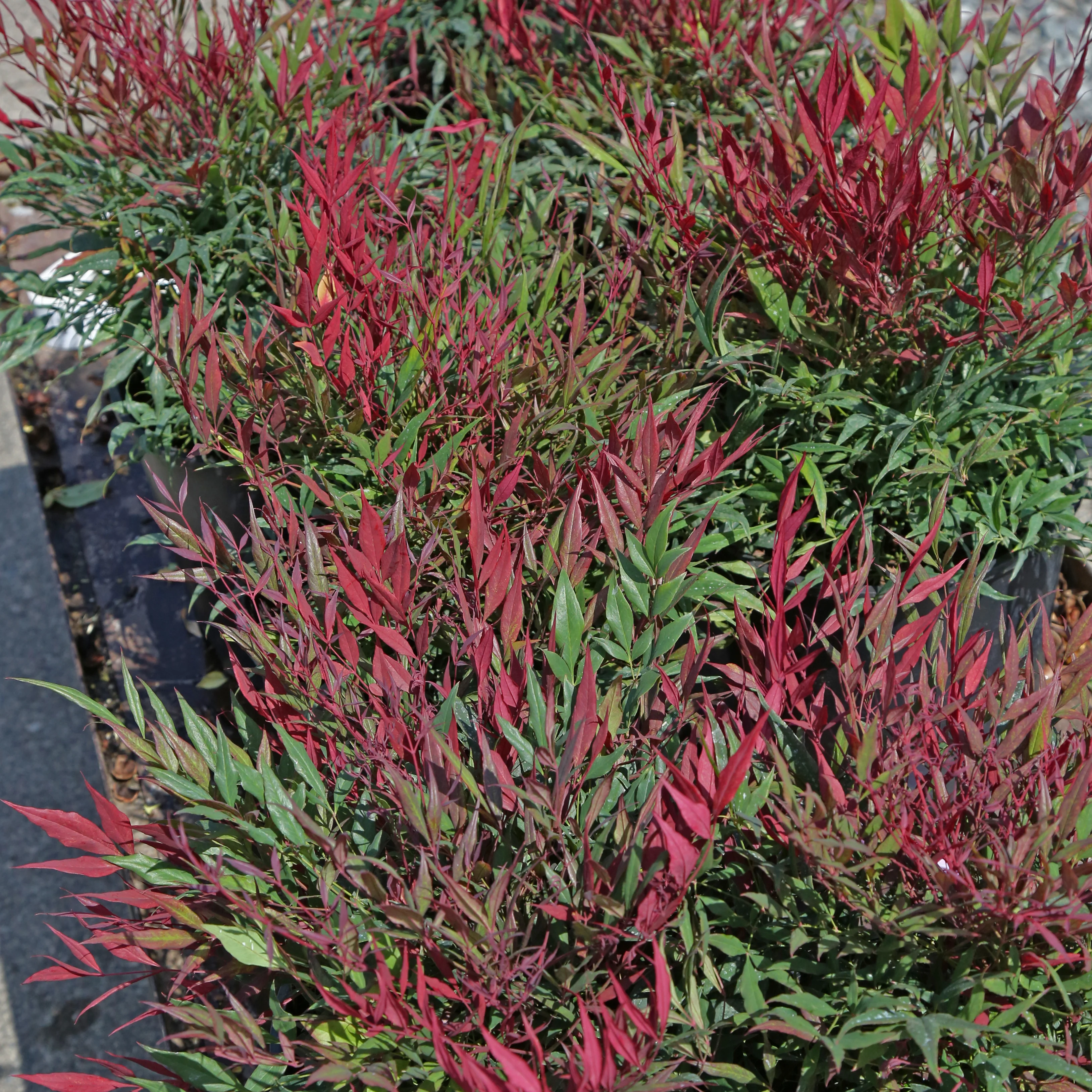 An evergreen Nandina "Heavenly Bamboo" with finely textured foliage; new growth in spring is burgundy which fades to green and red in the summer, turning bright red in the fall. Has white flowers in summer which yield white berries (not edible) that stay on into winter.